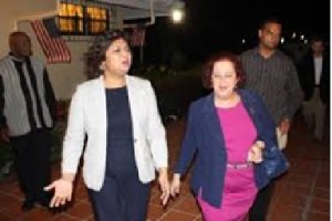 Shortly after cutting the 238th Independence Anniversary cake, Manickchand and presidential advisor on Governance, Gail Teixeira walked out of the reception at the American ambassador’s residence in Cummings Lodge.