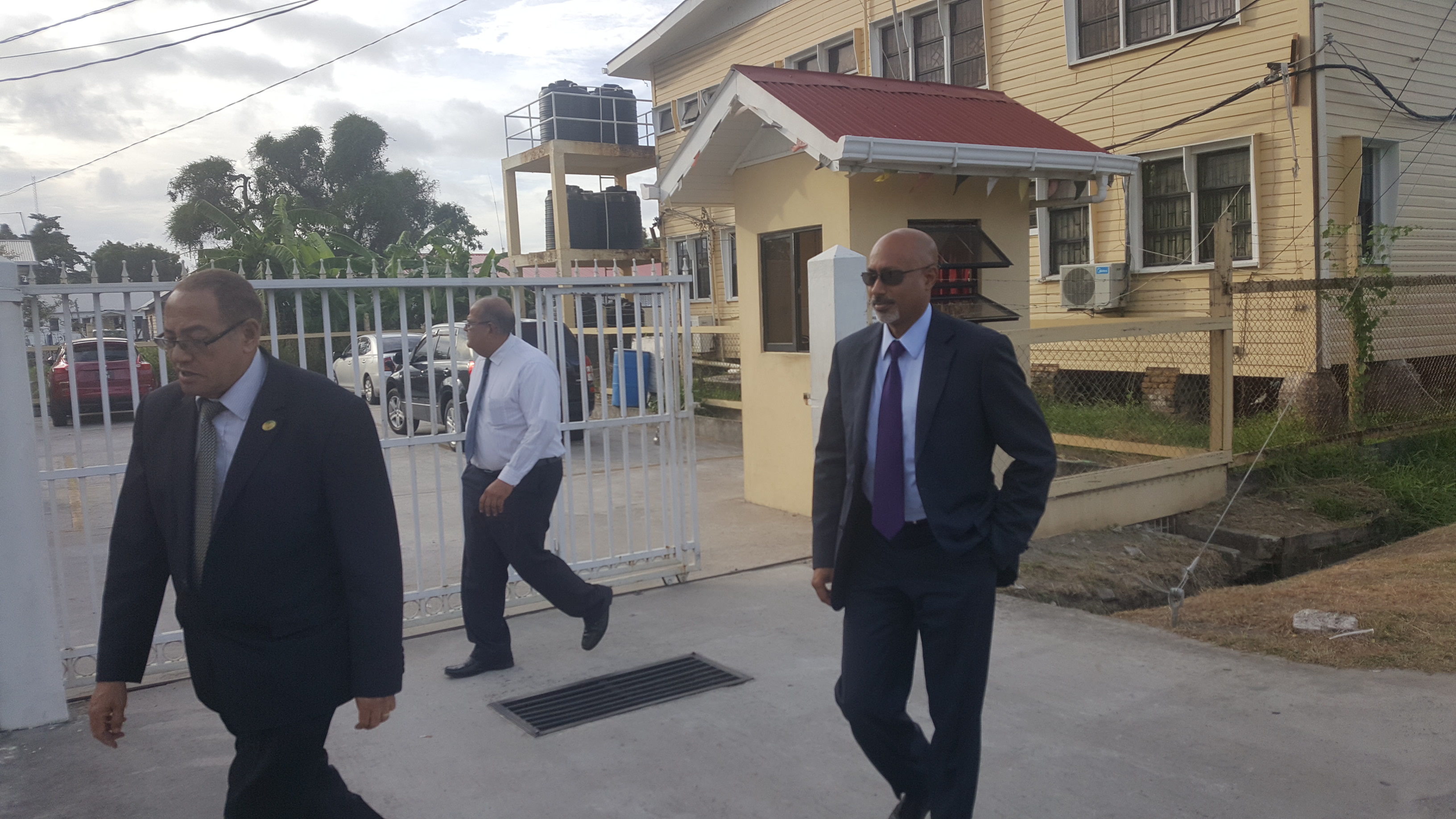 Directors of GBTI including Suresh Beharry and Robin Stoby leave the office of the Special Organised Crime Unit.