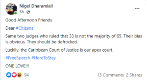 Shortly after the majority 2-1 decision by Justice Dawn Gregory and Chancellor of the Judiciary, Yonette Cummings that the Guyana Court of Appeal has a right to hear an appeal of the High Court’s decision to throw out an election petition, Mr. Dharamlall called for their removal on his Facebook profile.