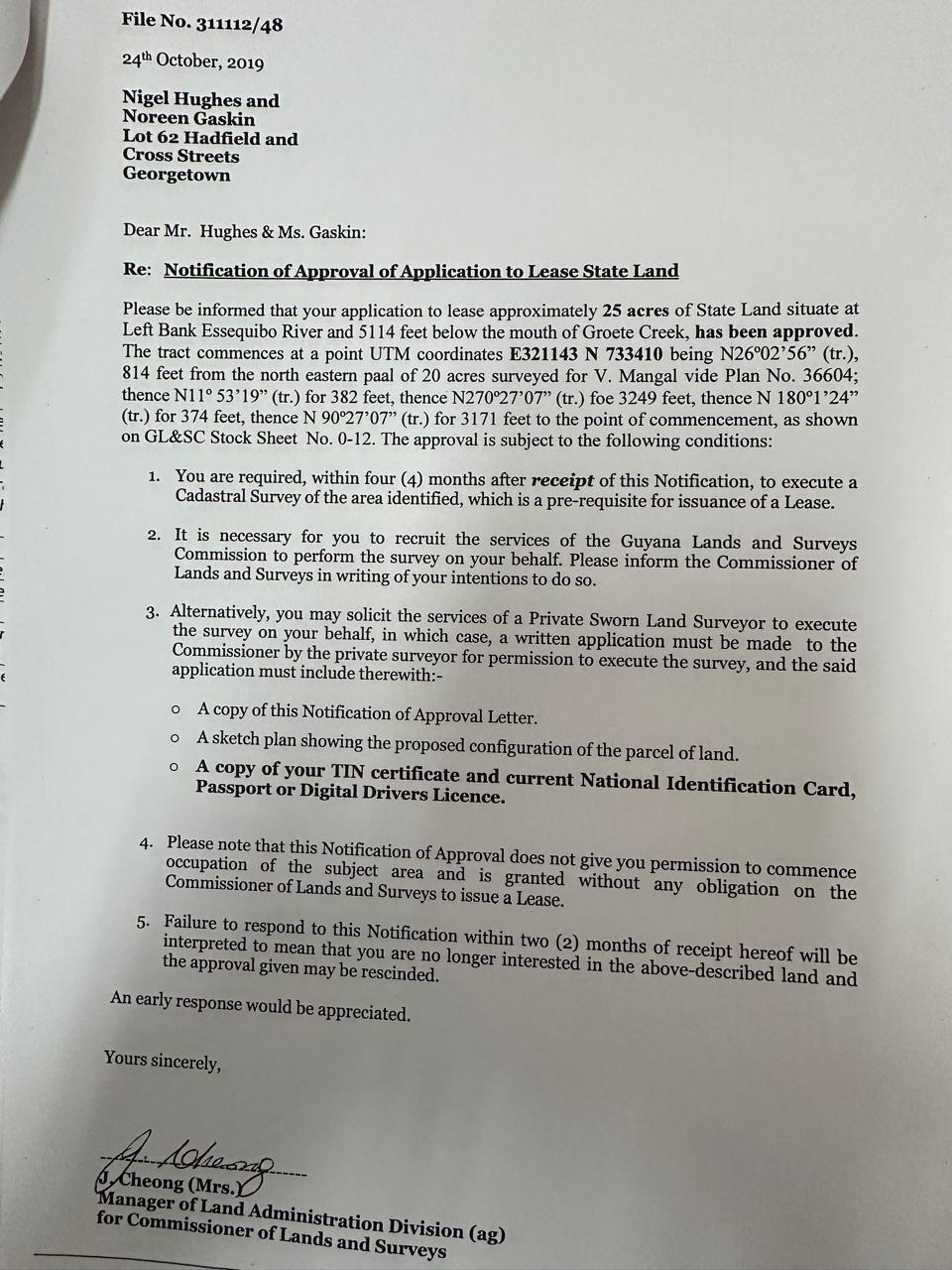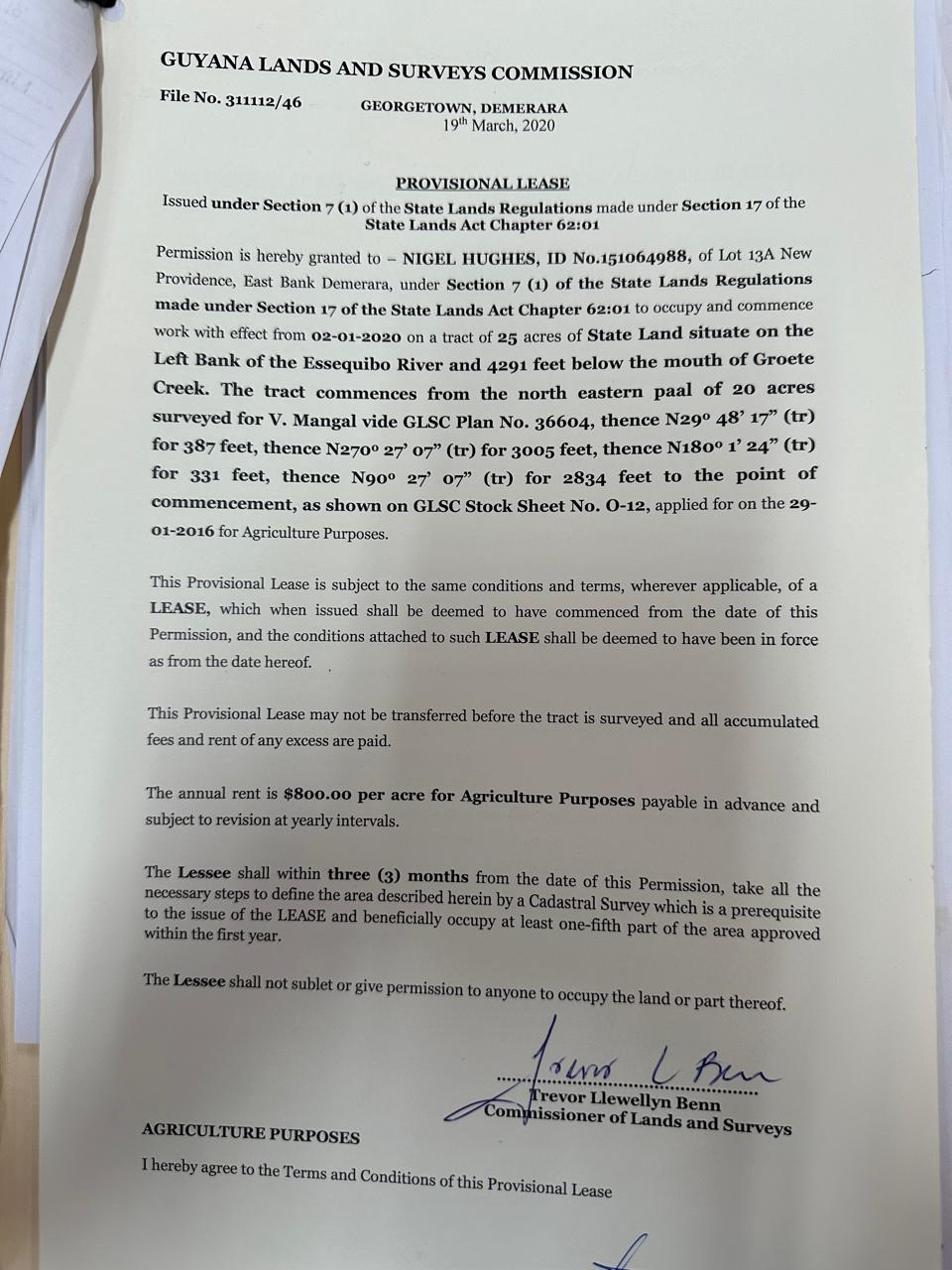 Meanwhile, the AFC Leader Thursday night released an agreement of sale between himself and Simon Munroe dated 28th January, 2016, for the acquisition of 50 acres of land on the western bank of the Essequibo River for GY$2 million. Mr Hughes also posted a letter dated 4th March, 2024, to the Commissioner 0f the Guyana Lands and Surveys Commission, Enrique Monize telling him that he did not respond to two previous letters on January 13, 2022, and 19th September, 2023, concerning final leases that were not issued.