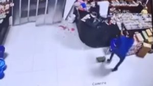The armed security guard emerged from inside the supermarket and confronted the bandits, both of whom started running in an attempt to exit the supermarket. One of the suspects fell to the ground inside the supermarket, while the other ran out of the supermarket and fell onto the road about 15 feet west of the supermarket,” the police force said.