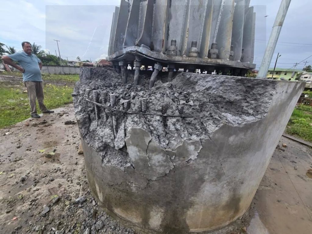 The power company’s reinforced concrete base for one of the utility poles was partly shattered, and the metal pole’s base was partly warped and semi-dislocated.