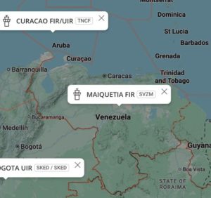 They are not national boundaries. Venezuela manages the MAIQUETIA FIR, which includes all of Venezuelan land and extends into the Caribbean Sea approximately 350 miles at its furthest point.
