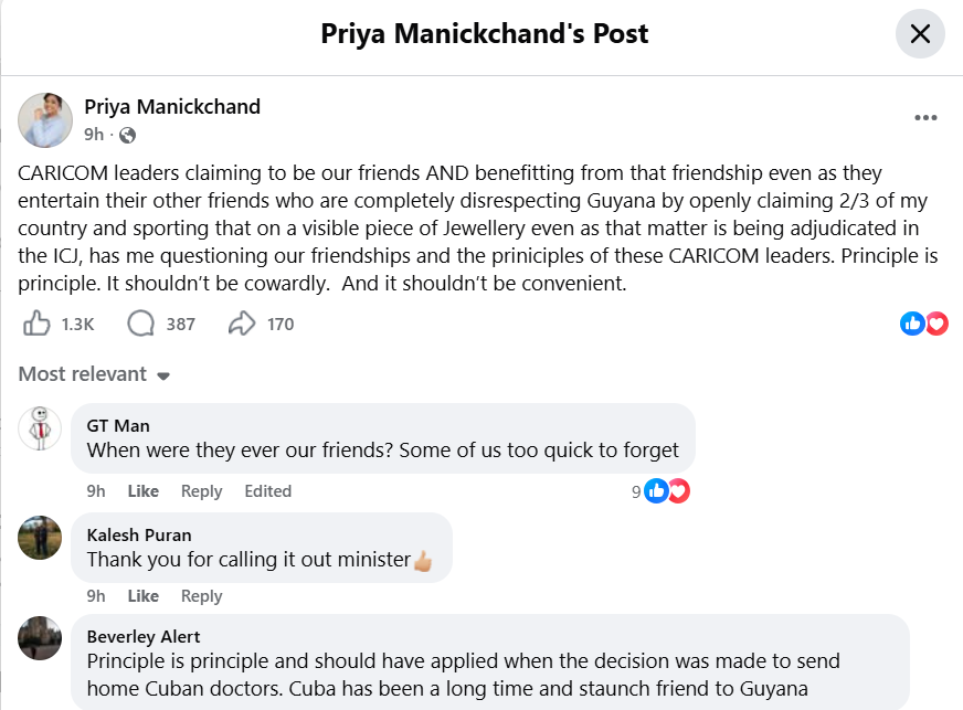 “CARICOM leaders claiming to be our friends AND benefitting from that friendship even as they entertain their other friends who are completely disrespecting Guyana by openly claiming 2/3 of my country and sporting that on a visible piece of jewellery even as that matter is being adjudicated in the ICJ, has me questioning our friendships and the principles of these CARICOM leaders,” she said in a Facebook post late Monday night.